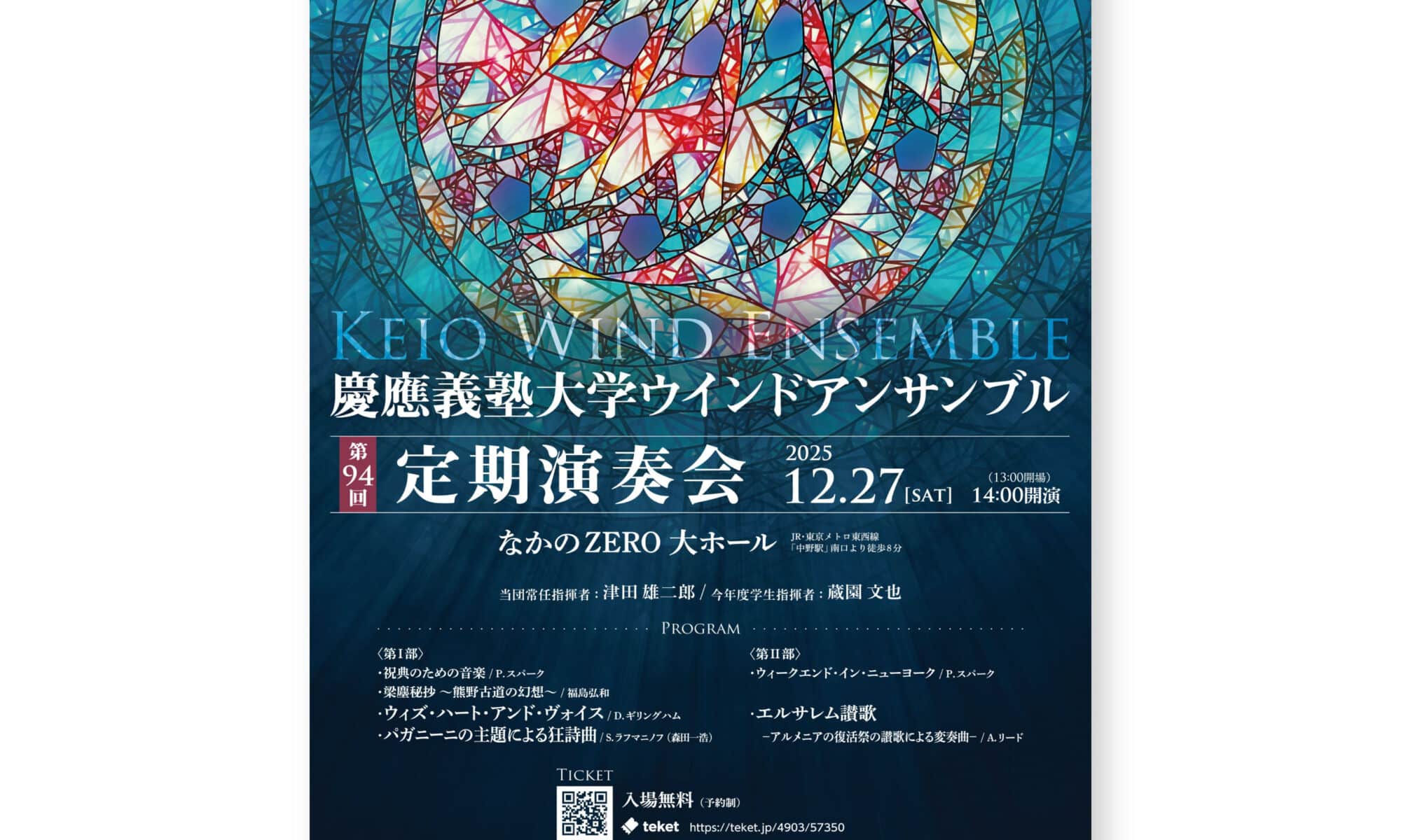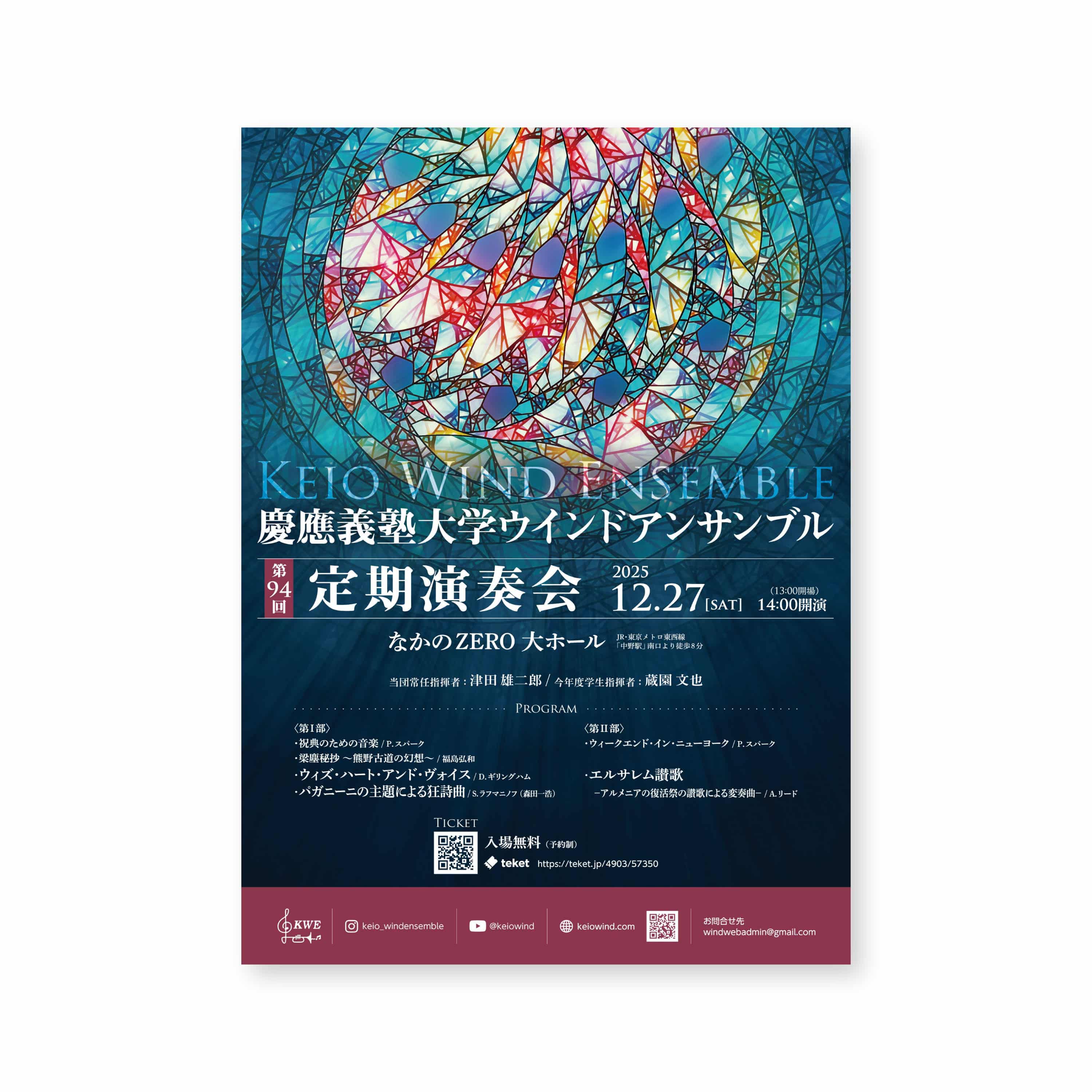 慶應義塾大学ウインドアンサンブル 第94回定期演奏会 光が差し込む教会のステンドグラスをイメージしてデザインしました。 英字は光に透けたような表現にし、厳かな空気感を感じられるように意識しました。 関連
