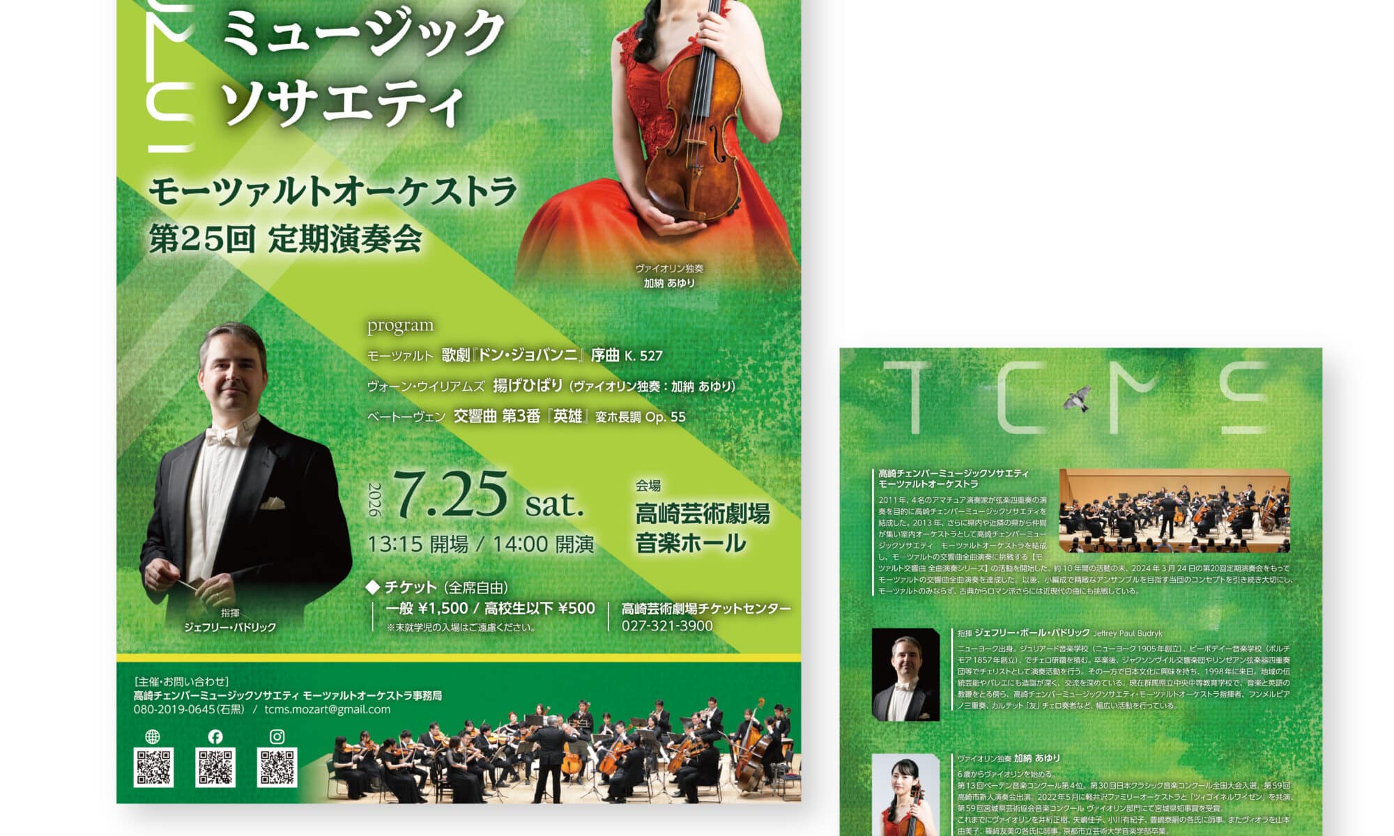 高崎チェンバーミュージックソサエティ モーツァルトオーケストラ 第25回 定期演奏会 爽やかな初夏の風を感じられる、グリーン系の色味で仕上げました。 ひばりが飛ぶ軌跡や影を斜めのラインで表現し、モダンなテイストを加えています。 関連